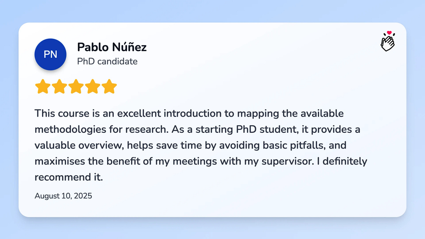 P.S.: Curious to explore how we can tackle your research struggles together? I've got three suggestions that could be a great fit: A seven-day email course that teaches you the basics of research methods. Or the recordings of our AI research tools webinar and PhD student fast track webinar.